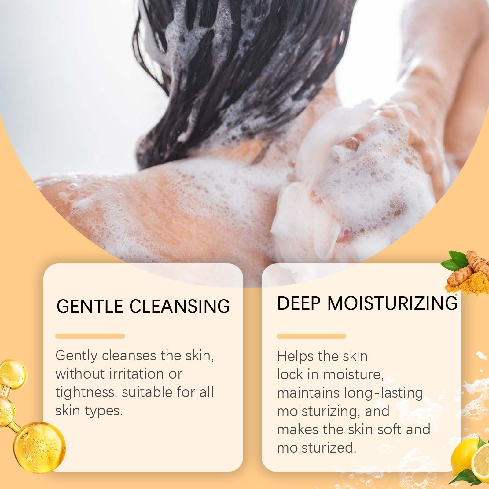 Our lemon turmeric soap contains turmeric root extract, kojic acid, lemon extract. It gently cleanses the skin without irritation or tightness and is suitable for all skin types. Its application is simple: First wet the face and body with warm water. Place the product in the palm of your hand and gently rub several times until a rich, delicate foam is created, then apply evenly to the face and body and massage gently with a gentle circular motion. Rinse well with water. And it can help the skin to lock in moisture, maintain lasting moisture, skin soft and moist.